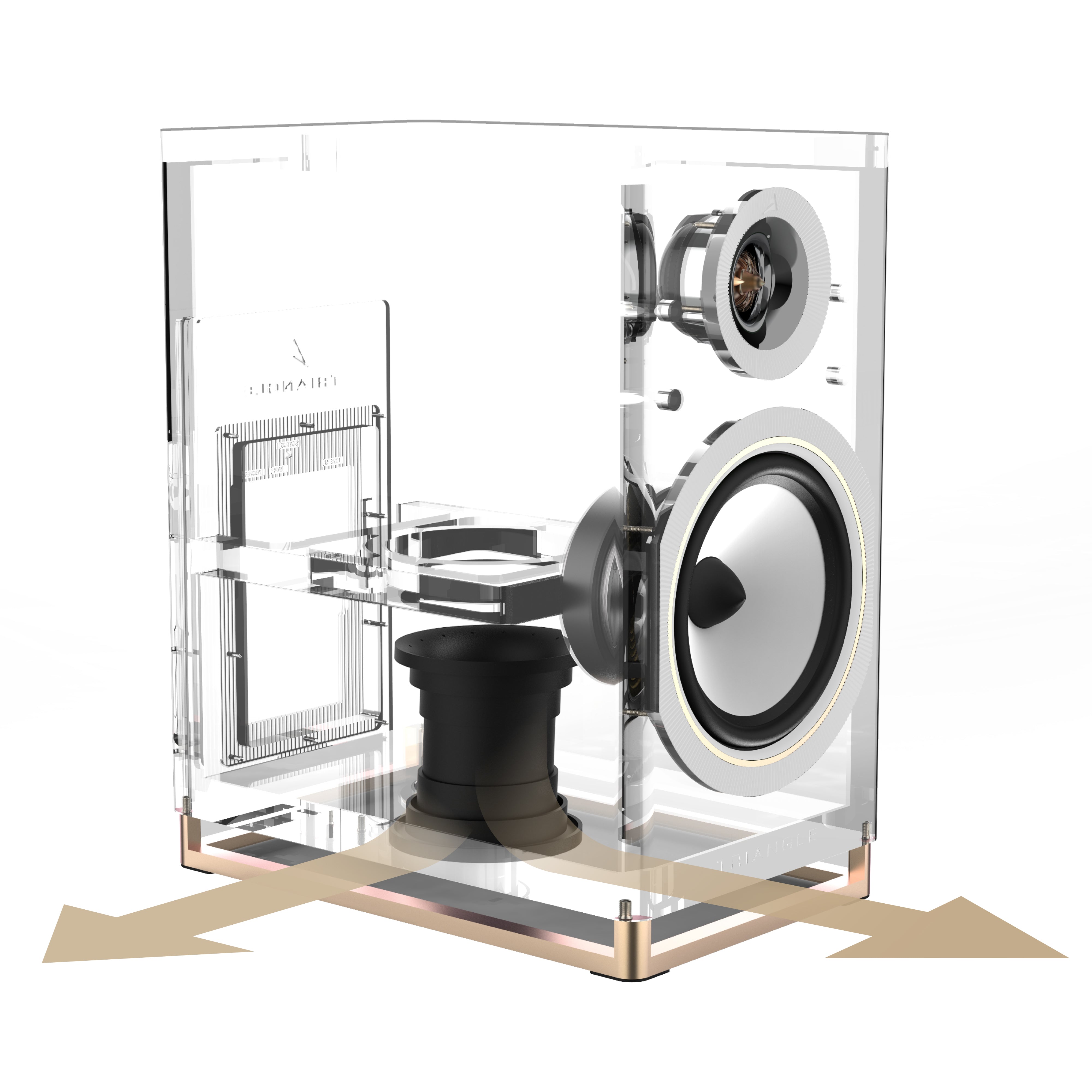 Se han realizado investigaciones exhaustivas para reducir la vibración interna del gabinete. Los altavoces CAPELLA 2 utilizan el sistema patentado TRIANGLE DVAS (*Sistema de Absorción de Vibraciones del Transductor), un refuerzo perforado de alta densidad que se apoya contra el transductor mediante un material amortiguador, lo que refuerza el conjunto transductor/gabinete.