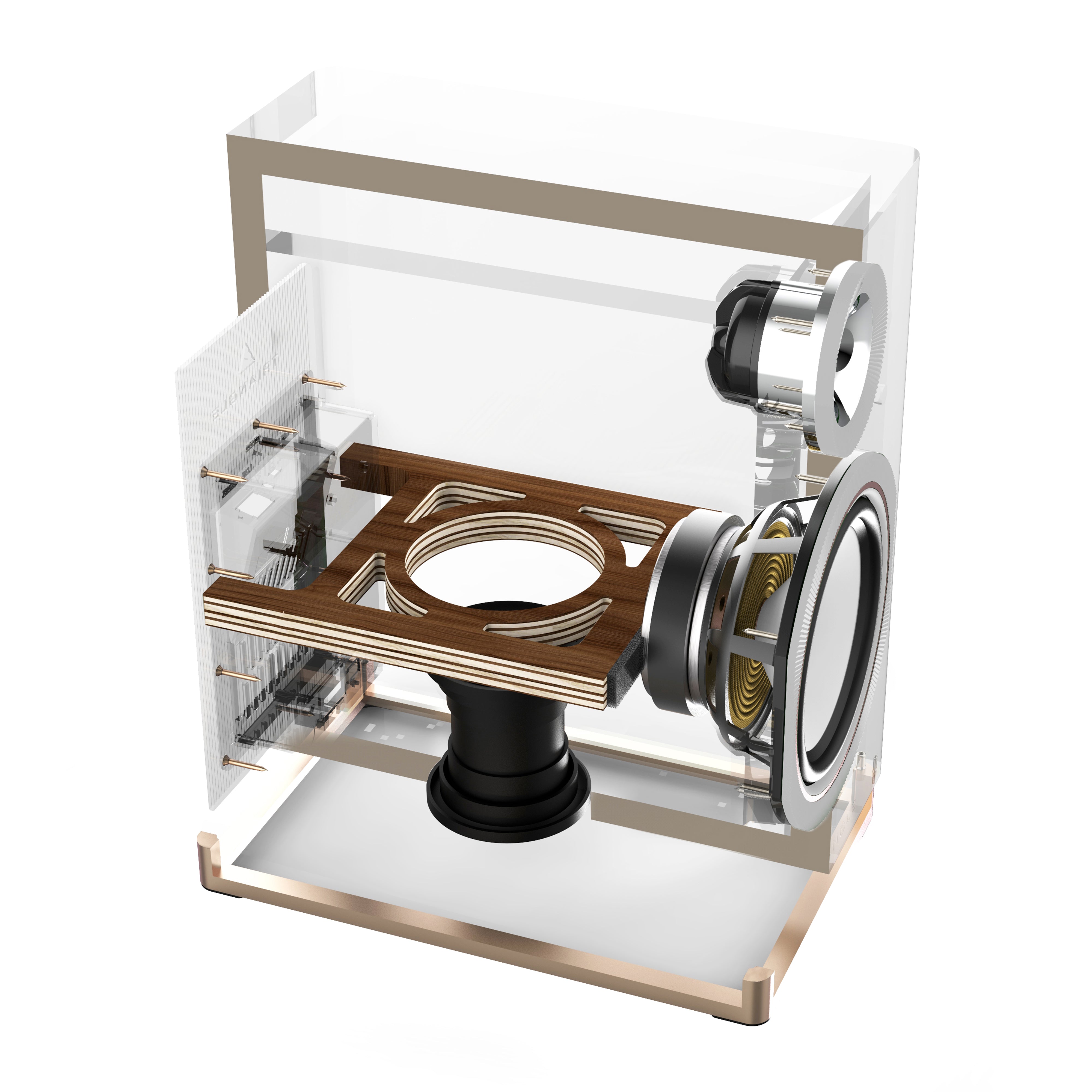 Una junta de espuma EVA de alta densidad, colocada al final de cada soporte interno, garantiza el contacto entre el motor del altavoz y el soporte. Esto amortigua considerablemente las vibraciones del transductor generadas por el movimiento del diafragma, lo que resulta en una mínima transmisión de vibraciones residuales a la caja.
